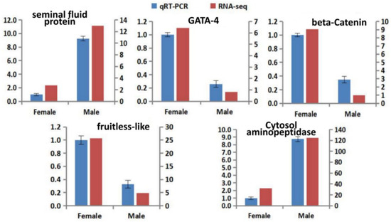In order to validate the reliability of the transcriptome sequencing data, the expressions of five genes (CL1718.Contig1_All/fruitless-like, CL4096.Contig1_All/beta-catenin, Unigene6400_All/cytosol aminopeptidase, Unigene11772_All/seminal fluid protein and CL6380.Contig6_All/gata4) were randomly selected from the 102 sex-determining and sex-differential genes identified in this work, and were analysed by qRT-PCR, with the elongation factor 1-alpha gene (Unigene19366_All) as reference. The dissolution curve of all of the primers had a single peak without any miscellaneous peak. The amplification efficiency of the reference gene was 98%. The relative mRNA expression of the unigenes assessed by qRT–PCR (Figure 10) was very similar to the levels shown in the RNA-seq analysis, suggesting the reproducibility and accuracy of the RNA-seq results.