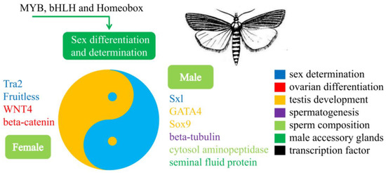 Taken together, the sex determination and differentiation-related genes identified in this study are candidate targets for the development of SIT for controlling C. sacchariphagu. In this respect, gata4, beta-tubulin, beta-Catenin, myb and bhlh are particularly valuable because they form the hub genes in the sex-related regulatory network. Based on these findings, a putative model is proposed (Figure 11). This includes fruitless, transformer-2 and sex-lethal as sex-determining factors; wnt4 and beta-catenin for ovarian differentiation; and gata4 and sox9 for testis development, beta-tubulin for spermatogenesis, and cytol aminopeptidase and seminal fluid protein for male accessory components. Here, it is also worth noting that the myb, bbhlh and homeobox TFs could be controlling sex determination and differentiation by regulating the activity of the above-mentioned genes. The genetic manipulation-based SIT has been used successfully in Lepidoptera moth insects, such as the diamondback moth [7], pink bollworm [82] and silkworm [6], suggesting the possibility of SIT for sugarcane borer control. Moreover, we used RNAi to silence genes in sugarcane borer, which further strengthen the application of SIT in sugarcane borer for male feminization, female masculinization and impaired reproduction ability. Clearly, a gene shows functional divergence in different species [29,30,31]. As such, more experiments are needed in order to determine candidate gene functions in sugarcane borer unequivocally.
