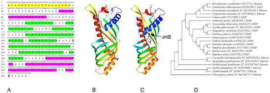 The sequence, predicted topology structures and phylogenetic tree of RaSsP1 in Reticulitermes aculabialis. (A) The cDNA sequence and the deduced amino acid sequence of RaSsP1 (GenBank accession no. UES72773.1). Yellow region: signal peptide; purple region: alpha helix; green region: beta fold. (B) Predicted 3D structure of RaSsp1. (C) Predicted binding model between JHIII and RaSsp1 with AutoDock. JHIII is marked in grey and pointed out with a black arrow. (D) The phylogenetic tree of RaSsp1 in insects was constructed using the maximum likelihood method based on amino acid sequences.