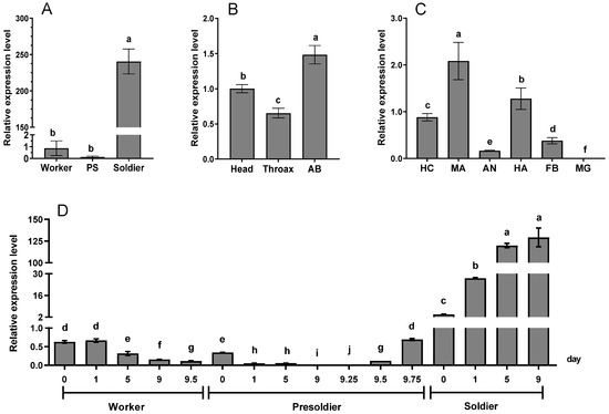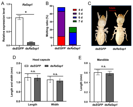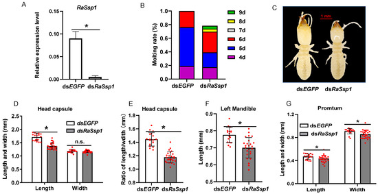 To observe the morphological effects, newly molted presoldiers and soldiers were collected every 24 h after dsRNA injection and were maintained in a new petri dish. Meanwhile, 4 times the amount of workers were placed to tend to the presoldiers and soldiers. The presoldiers and soldiers were photographed, and their local traits, including the length and width of the head capsule, the length and width of the pronotum, and the length of left of the mandible were measured under Stereo microscope Leica 205a (Leica Microsystems, Wetzlar, Germany), according to the measurement standard of specific weapons described in previous reports [17,36]. Every treatment was carried out 3 times. The digital photos were overlaid and connected using software Helicon Focus v7.6.6. For gene expression analysis after the RNAi treatment, the individuals were collected 3 days after injection with RaSsp1 dsRNA.