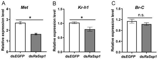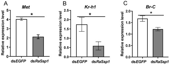 Next, we evaluated the effects of RaSsp1 on the expression of the JH receptor gene Met, its key transcription factor kr-h1, and the ecdysone signal genes Br-C by RT-qPCR. Expression of Met decreased on the 3rd day after injection, from 4.02 ± 0.21 to 2.12 ± 0.38 (p < 0.01) (Figure 6A). RaSsp1 RNAi reduced the expression of kr-h1 by 27% (from 2.66 ± 0.19 to 0.72 ± 0.13) (p < 0.01) (Figure 6B) and Br-C by 27.35% (p < 0.01) (Figure 6C).