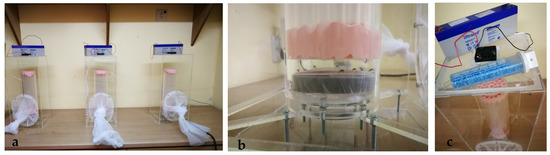 Flight capacity test: a flight testing device (FTD, Figure 1a), a recently designed quality control device developed in the insect pest control laboratory (IPLC) of IAEA [33], was used to assess male quality. Testing started after all males in all cages had emerged and when they were 2–4 days old. From each cage (replicate), 50 males were tested; they were introduced initially at the base of the device cylinder, which consisted of a series of tubes (Figure 1b). On the top of the device covered by the net, a BG lure was placed to encourage males to fly to the top, against the air current produced by the fan (Figure 1c). Males that passed through cylinder within a period of 2 h were considered as those that passed the test. The percentage of passed males out of the number of total males initially introduced in the cylinder was calculated. Males that did not pass the test remained inside the cylinder. Males produced from one replicate of each of the three diets were tested simultaneously (three test devices, Figure 1). The flight test was performed in three series to test all the replicates of the three diets.