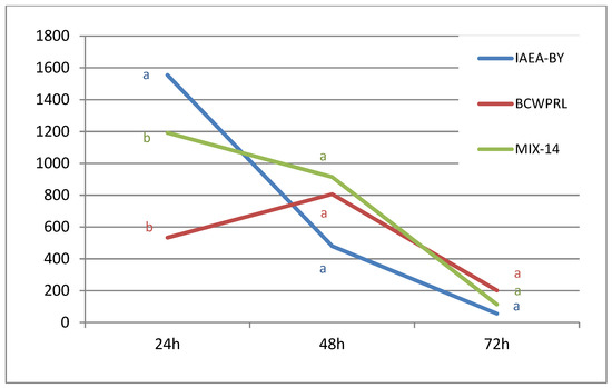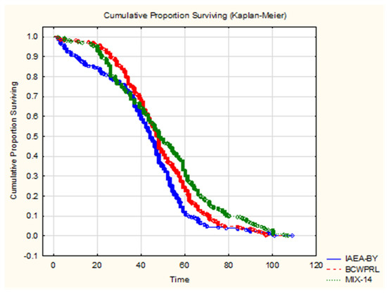 A comparison by Log rank test showed a significant difference in mean survival times between IAEA BY and BCWPRL (ρ = 0.02), and between BCWPRL and MIX-14 (ρ = 0.01). A difference in longevity was highly significant between IAEA BY and MIX-14 (ρ < 0.01).