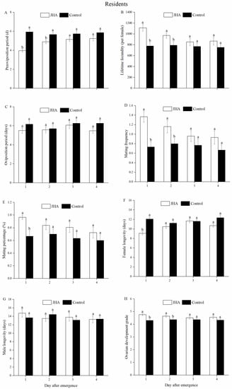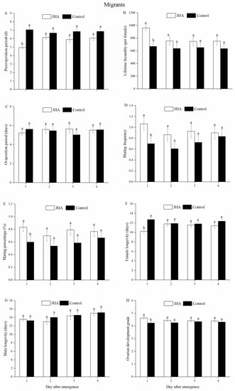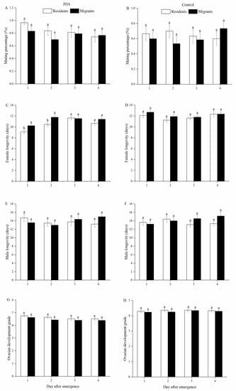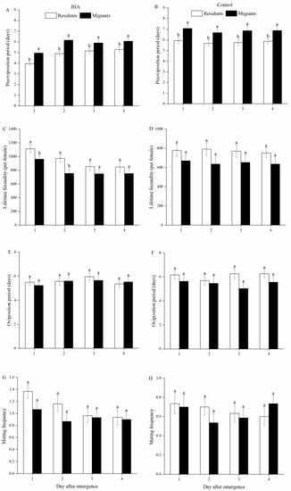 Our study showed that various reproductive traits exist between residents and migrants exposed to JHA in M. separata. Residents exhibited a shorter pre-oviposition period (POP) than the migrants in both JHA and control treatments, which was consistent with previous reports that residents showed stronger reproductive capacity [,,,]. Resident moths exposed to JHA on the first 2 days after adult emergence could facilitate their reproduction. By contrast, migrant moths exposed to JHA only on the first day after adult eclosion accelerated their reproductive performances.