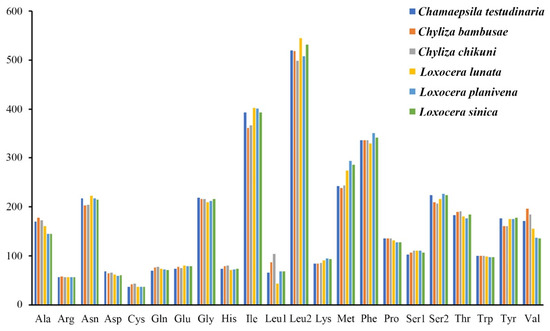 Patterns of codon usage of mitochondrial protein-coding genes of 6 Psilidae species. The X-axis shows the codon families, and the Y-axis shows the total codons.