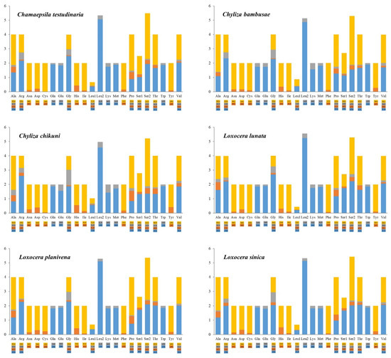 Relative synonymous codon usage (RSCU) of mitochondrial protein-coding genes of 6 Psilidae species. The X-axis shows different amino acids, and the Y-axis shows the RSCU value (the number of times a certain synonymous codon is used/the average number of times that all codons encoding the amino acid are used).