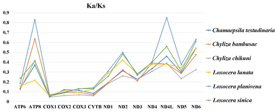 Evolutionary rates (ratios of Ka/Ks) of mitochondrial protein-coding genes of 6 Psilidae species. Abbreviations: ATP6 and ATP8 for adenosine triphosphate (ATP) synthase subunits 6 and 8; COX1–COX3 for cytochrome C oxidase subunits I–III; CYTB for cytochrome b; and ND1–ND6 and ND4L for nicotinamide adenine dinucleotide hydrogen (NADH) dehydrogenase subunits 1–6 and 4L.
