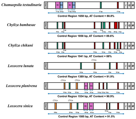 The control region (CR) is the longest non-coding region of the 6 Psilidae mitogenomes. The control regions are considerably variable in length, ranging from 1389 bp to 1941 bp, and appear much higher A + T content (88–91.9%) than the whole mitogenomes (Table 2). Several repeat sequences have been detected in 3 of the 6 Psilidae mitogenomes (Figure 5): 2 types of repeat units are found in the control region of Cha. testudinaria, whereas the control region of L. planivena and L. sinica each contains only a single type of repeat units. Besides, poly-A regions are found at the end of control region in all sampled species, and 4 poly-T and 5 poly-A regions are presented in the control region of the 2 species of Chylizinae (Figure 5). Furthermore, several microsatellite-like “(TA)n” units (16–24 bp) are found in the control region of the 3 Loxocera species (Figure 5). These simple sequence repeats (SSRs) have been considered as potential useful molecular markers in species identification, genetic diversity studies, and phylogenetic analyses [23,86]. The above results indicate that the length, the nucleotide compositions as well as the copy numbers of repeat units in the control regions are highly variable among the known Psilidae mitogenomes, and such structural differences may provide useful information for phylogenetic and evolutionary studies of rust flies. Besides, in all sampled species, an intergenic region over 25 bp in length is detected between trnE and trnF, with the longest one in Cha. testudinaria (103 bp).