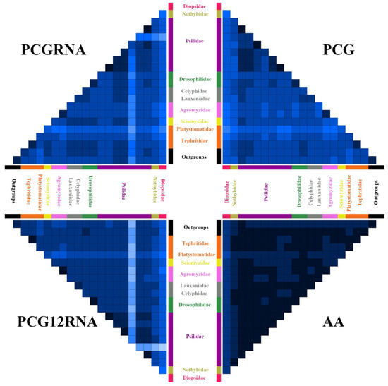 The sequence heterogeneity analyses show that the degrees of heterogeneity of the AA and PCG12RNA datasets are lower than those of the PCG and PCGRNA datasets (Figure 6). The lower heterogeneity of PCG12RNA dataset compared to the PCGRNA dataset indicate that third codon positions have higher heterogeneity than the first and second ones, as expected. The species of the family Diopsidae (Teleopsis dalmanni (Wiedemann)), Nothybidae (Nothybus sumatranus Enderlein) Nothybidae), and Platystomatidae (Prosthiochaeta sp.) exhibit a stronger heterogeneity in sequence divergence than to other acalyptrate species in all 4 datasets (Figure 6). The conspicuous high heterogeneity in sequence divergence of Chamaepsila rosae (Fabricius) (Psilidae) in the PCG12RNA and PCGRNA datasets (Figure 6) is attributed to a large amount of missing data in the rRNAs of the sequence. Highly heterogeneous sequences have been shown to reduce the nodal support confidence and topology accuracy [8,87,88], and the use of the heterogeneous model in phylogenetic analyses will largely improve the impact of heterogeneous sequences [9,89]. Therefore, the site-heterogeneous mixture CAT + GTR model was used in the phylogenetic analyses in this study.