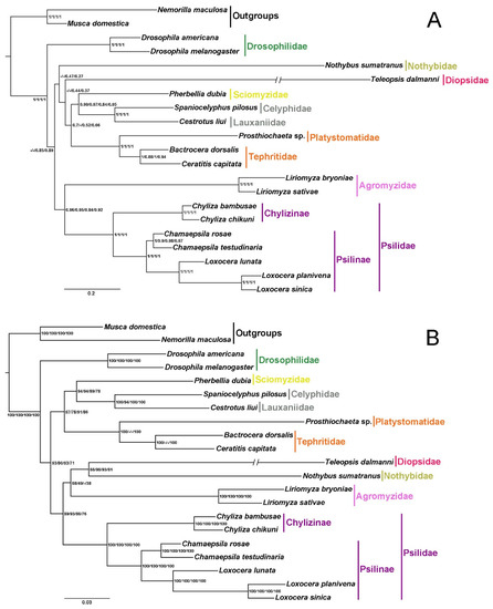 Psilidae, commonly known as rust flies, is a group of small to medium-sized, yellow or black acalyptrate flies with reduced body setation [26]. Psilids are of economic importance because their phytophagous larvae burrow in the roots, stems, and tubers of plants [26,27,28] and sometimes cause considerable damage on bamboos [29,30], carrots, [31,32] and other root crops [33,34]. Some species have also been reported to induce galls [35,36]. With about 340 species being described so far, Psilidae is distributed in all zoogeographic realms with the highest diversity in the Old World and the Nearctic region, and a few species also occur in the Neotropical region [28,37]. Members of Psilidae are currently assigned into 3 subfamilies (Belobackenbardiinae, Chylizinae, and Psilinae), whereas the genus-level classification within Psilidae has been debated for a long time, especially the status of some generic taxa of Psilinae needs to be reconsidered [27,28,38,39]. In addition, the taxonomic, phylogenetic, and evolutionary studies of Psilidae have largely relied on morphological characters from adults, larvae, and eggs [38,39,40,41], and the comparative and phylogenetic analyses of this family based on molecular data remain unconducted.