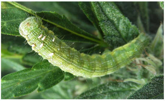 Despite the potential of agricultural hemp, many decades of prohibition have stifled research on the management of insect pests and their impacts on cultivated hemp [6]. More than 270 species have been documented as feeding on C. sativa around the world, including defoliators, chewing, and sucking insects and mites, stem and stalk borers, and root feeders [7,8,9]. Among this diversity of potential pests, lepidopterous stem borers (e.g., Ostrinia nubialis) and budworms (e.g., Heliothis spp., Helicoverpa spp.) have been singled out as the most recurrent and severe problems in hemp field crops across the United States [10]. In particular, the corn earworm (CEW) Helicoverpa zea (Boddie) (Lepidoptera: Noctuidae) is a prevalent pest on hemp that can reach outbreak densities [11]. This species is a rising concern among hemp growers who have reported infestations in Colorado, Illinois, Indiana, Kentucky, Nevada, North Carolina, Tennessee, Vermont, Virginia, and Wisconsin [2,12]. Because CEW feeds on flower buds, the most valuable part of cultivars grown to produce cannabidiol, it is considered a key pest of hemp.
