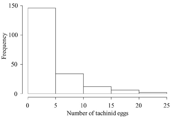 Histogram of visible tachinid eggs per host.