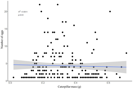 The number of tachinid eggs per host was unrelated to host mass (Figure 4, t = −0.47, df = 198, p = 0.63), but varied significantly across body regions (F = 154.5, df = 2, p < 0.001), with 89% of eggs located on the thorax region. There was no relationship between the body mass of CEW larvae and the number of eggs on each of the body regions (thorax, middle, posterior).