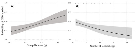 Predicted probability of CEW survival with respect to body mass (a) and number of tachinid eggs per host (b). Grey areas indicate the standard error.
