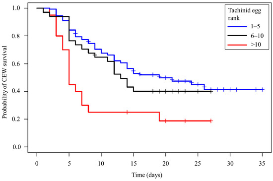 Host mortality and adult tachinid emergence varied significantly among parasitoid egg rank categories (χ2 = 28.6, df = 4, p < 0.001), with the lowest host survival and highest proportion of adult fly emergence when >10 eggs were present on the CEW larva (Figure 7). The median survival time of parasitized CEW larvae was 15 days. Survival time was associated with the number of parasitoid eggs. For caterpillars with 1–5, 6–10, and >10 parasitoid eggs, the median survival time was 19, 13, and 5 days, respectively (Figure 8). The divergence of the three survival curves was statistically significant (χ2 = 14.9, df = 2, p < 0.001).