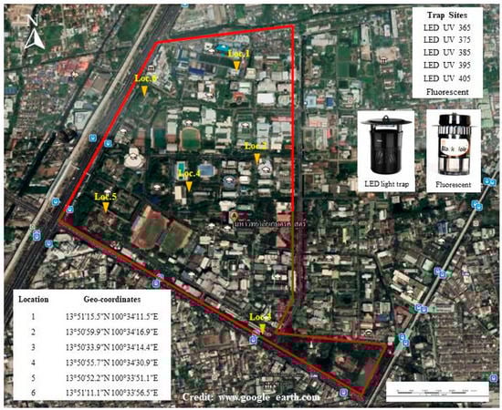 This study was conducted at the Kasetsart University (KU) (13°50′32.96″ N, 100°34′2.98″ E), Bangkok, Thailand. The campus covers 135.7 hectares and is categorized as an urban area. The campus consists of either buildings or natural sites that provide an ideal breeding habitat for mosquitoes. In total, six square grids (approximately 1.3 km2/grid) were overlaid on a map of the campus and used as six study locations: Chobprachoom Building, Faculty of Fisheries (Loc. 1), Faculty of Agriculture (Loc. 2), Ngamwongwan 1 Parking Garage (Loc. 3), KU Dormitory for male students (Loc. 4), the Office of Agricultural Museum and Culture (Loc. 5) and the Entomology Research Building (Loc. 6), as shown in (Figure 1). Each grid was subdivided into six smaller squares in which trap locations were randomly selected.