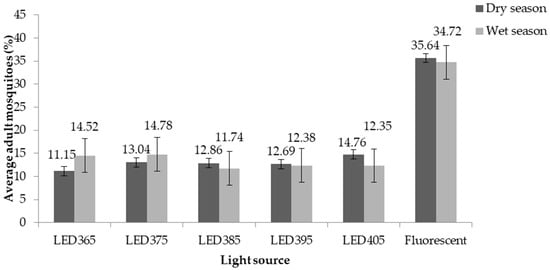 Five LED-UV traps with different spectral ranges (365–405 nm) were compared with one fluorescent light source for efficacy in trapping urban mosquito species. Traps were set for 72 nights collection in both the dry and wet seasons. In total, 6929 adult mosquitoes were recorded in the trap types: fluorescent UV (35.64%, 34.72%), LED405 (14.76%, 12.35%), LED375 (13.04%, 14.78%), LED395 (12.96%, 12.38%), LED385 (12.86%, 11.74%), and LED365 (11.15%, 14.52%), as shown in (Figure 2).