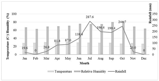 The experiment was conducted during two seasons: dry (February–April) and wet (July–September). The meteorological data indicated that there was higher rainfall between July and October than for the other months of the year. The highest rainfall was in July (287.6 mm), whereas no rainfall (0 mm) was recorded in February and December. The mean relative humidity and temperature were also recorded (Figure 3).