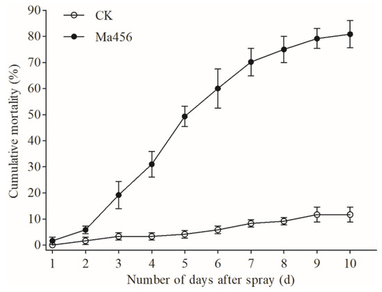 Cumulative mortality rate of BPH fifth-instar nymphs infected by Ma456. Error bars: SD of the mean from three replicates.