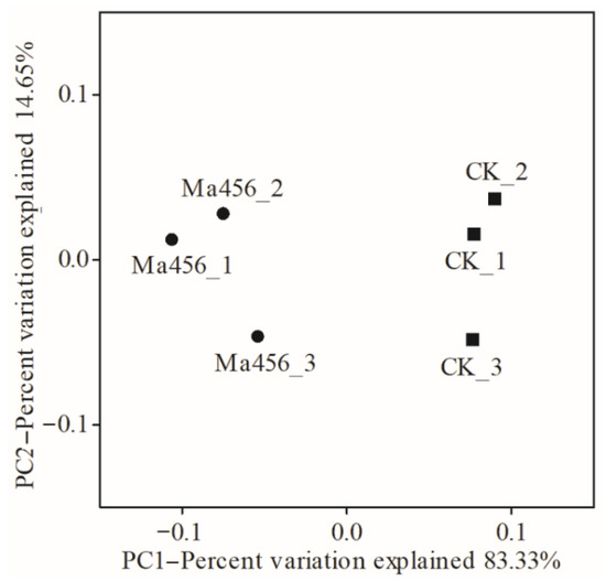Principal coordinate analysis (PCoA) of beta diversity based on the weighted UniFrac distance metric for gut bacterial communities in the fungus-infected (Ma456) and 0.02% Tween 80-treated (CK) BPH.