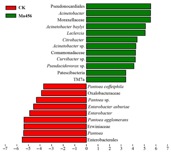 Different structures of gut bacteria between the fungus-infected (Ma456) and 0.02% Tween 80-treated (CK) groups identified by LEfSe analysis with linear discriminant analysis (LDA) scores of 3.0. Differentially abundant taxa are represented by histograms with LDA scores (red, CK; green, Ma456).