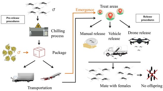 Handling procedures for shipping and releasing of sterile males in SIT mosquito projects. SIT is divided into two parts, the pre-release and the release procedures. The pre-release procedures include chilling, package and transportation. The release of sterile male mosquitoes can be performed either manually, by vehicle or drone. The black arrow shows the handling procedure of the adult mosquito, while the orange arrow adds the operations for the pupae.