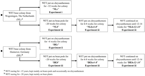 For each NL and DE base colony, a further three derived colonies were established on different host-plant rearing regimes for comparison in the colour choice tests (Experiment iii). Colonies NLb and DEb were established from NL and DE, respectively, and reared on fresh green bean pods for at least ~20 weeks. The NLbc4-8 and DEbc4-8 colonies were established from NLb and DEb, respectively, and reared on chrysanthemum for 4 to 8 weeks. Finally, colonies NLbc12-14 and DEbc12-14 were a continuation of NLbc4-8 and DEbc4-8, respectively, and continued to be reared on chrysanthemum for 12 to 14 weeks (Figure 1).