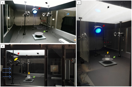 General lighting in the wind tunnel was provided by LED strips situated on the ceiling over the test arena (Figure 2, black arrows). This had a light spectrum component in the visible range 400–750 nm (LED-strip–Full-colour RGB + Warm White—24V High Power Protected 5050, LuxaLight, Eindhoven, The Netherlands) and a component in the ultraviolet light (UV-A) range from 360 to 390 nm (strip of UV LED Engin, LZ4-04UV00, Osram Sylvania Inc., Wilmington, MA, USA) (Supplementary Figure S1). The amount of UV-A emitted from the ceiling LEDs was set as 2% of the visible light to approximate that found in natural sunlight.