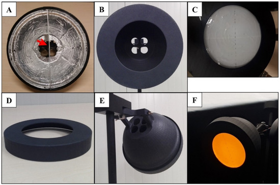 Aspects of the 3D printed dome housing the LEDs. (A) Frontal view showing the interior covered with aluminium foil, red arrow shows the division inside the dome. (B) Frontal view with the frame attached. (C) LED lamp with the diffusing glass plate and transparent propylene sheet with sticky glue. (D) Removable frame where the transparent sticky plastic was placed for catching the WFT. (E) Back side of the dome showing the four visible orifices where LEDs were placed. (F) LED lamp inside the wind tunnel shining a yellow and blue LED from inside the dome.