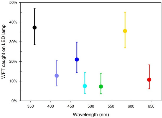 - Stukenberg, N.; Gebauer, K.; Poehling, H.-M. Light Emitting Diode (LED)-based Trapping of the Greenhouse Whitefly (Trialeurodes Vaporariorum). J. Appl. Entomol. 2015, 139, 268–279. [Google Scholar] [CrossRef]