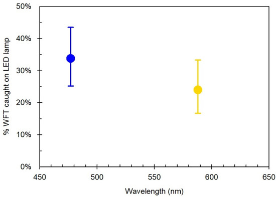 In a single-choice test, the DE WFT reared on chrysanthemum showed a trend towards blue over yellow, with 34% caught on blue compared to 24% on yellow (Figure 5), although the difference was not statistically significant (p = 0.104).
