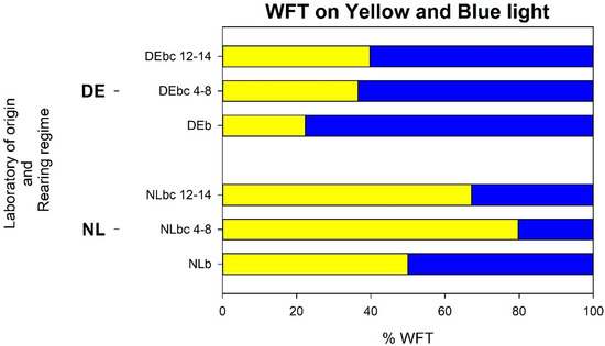Experiment iii:Choice-test response to blue and yellow by NL and DE WFT from different host plant rearing regimes.