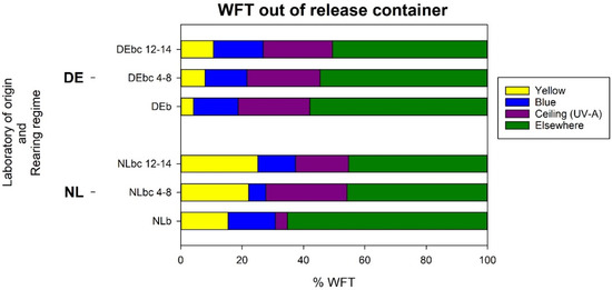 In addition to WFT landing on the blue or yellow halves of the sticky glass plate, the distributions of those that left the release container were also recorded as either on the ceiling (UV-A illuminated section) or elsewhere. The overall pattern of the distribution of thrips across the four locations varied significantly between the laboratory of origin (p < 0.001) as well as rearing regime (p = 0.001) with a statistically significant interaction between the effects (p = 0.004 for the interaction) (Figure 7).
