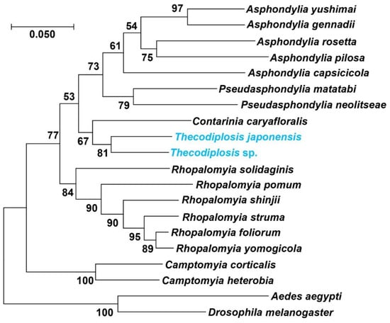 | Thecodiplosis | T. japonensis | Adult/Larvae (58/52) | June 2020 | Shandong China (33°230′18″ N, 126°370′40″ E) |