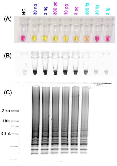 - Esmatabadi, M.J.D.; Bozorgmehr, A.; Zadeh, H.M.; Bodaghabadi, N.; Farhangi, B.; Babashah, S.; Sadeghizadeh, M. Techniques for evaluation of LAMP amplicons and their applications in molecular biology. Asian Pac. J. Cancer Prev. 2015, 16, 7409–7414. [Google Scholar] [CrossRef]