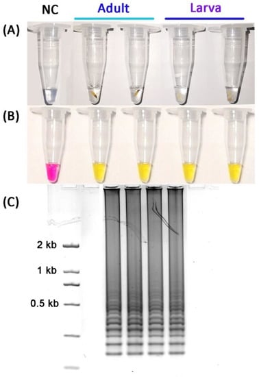 - Rako, L.; Agarwal, A.; Semeraro, L.; Broadley, A.; Rodoni, B.C.; Blacket, M.J. A LAMP (loop-mediated isothermal amplification) test for rapid identification of Khapra beetle (Trogoderma granarium). Pest. Manag. Sci. 2021, 77, 5509–5521. [Google Scholar] [CrossRef] [PubMed]