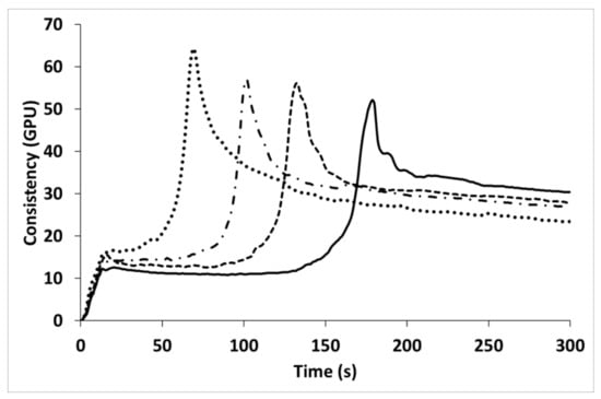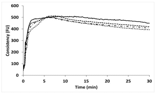 Gluten aggregation properties of wheat (solid line), and with increasing replacement level of cricket powder (5%: dashed line; 10%: dash–dotted line; 20%: dotted line). GPU—GlutoPeak Units.