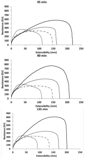 Extensional properties of wheat (solid line), and with increasing replacement level of cricket powder (5%: dash line; 10%: dash–dotted line; 20%: dotted line), after 45 min, 90 min, and 135 min of resting time. EU—Extensograph Units.