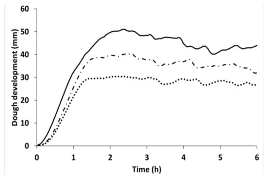 Dough-leavening properties of wheat (solid line), and with increasing replacement level of cricket powder (10%: dash–dotted line; 20%: dotted line).