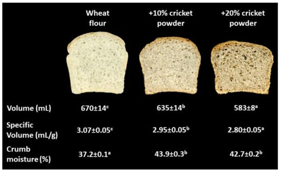 Pictures of the crumb, and quality indices (volume, specific volume, and crumb moisture) of bread prepared from wheat flour alone, and with increasing replacement level of cricket powder (10% and 20%). Data are expressed as mean ± standard deviation. Different letters in the same row correspond to significant differences (one-way ANOVA, Tukey’s HSD test, p ≤ 0.05).