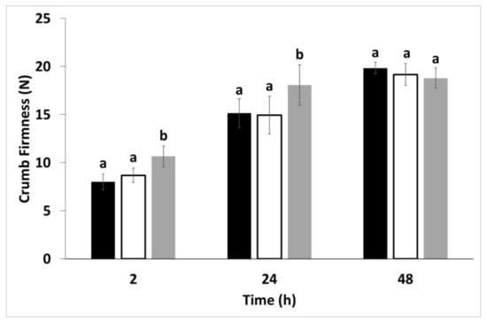 Crumb firmness of bread prepared from wheat flour alone (black), and with increasing replacement level of cricket powder (10%: white; 20%: grey), after 2, 24 and 48 h of baking. Data are expressed as mean ± standard deviation. Different letters at the same storage time indicate significant differences (one-way ANOVA, Tukey’s HSD test, p ≤ 0.05).