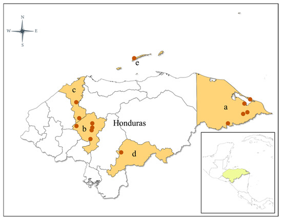 Map of Honduras showing study sites in five departments where entomological collections were conducted: (a) Gracias a Dios; (b) Comayagua; (c) Cortés; (d) El Paraíso; (e) Bay Islands.