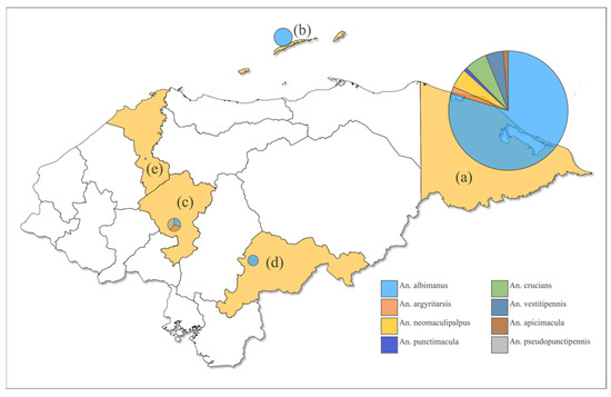 Map of Honduras showing pie charts with the proportion of Anopheles species collected at each department. Chart size is proportional to the number of specimens collected: (a) Gracias a Dios; (b) Bay Islands; (c) Comayagua; (d) El Paraíso; (e) Cortés.