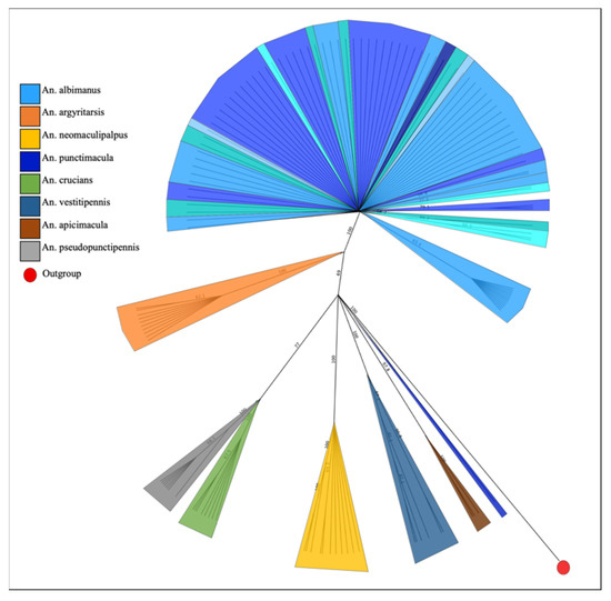 - Motoki, M.T.; Linton, Y.M.; Conn, J.E.; Ruiz-Lopez, F.; Wilkerson, R.C. Phylogenetic Network of Mitochondrial COI Gene Sequences Distinguishes 10 Taxa Within the Neotropical Albitarsis Group (Diptera: Culicidae), Confirming the Separate Species Status of Anopheles albitarsis H (Diptera: Culicidae) and Revealing a Novel Lineage, Anopheles albitarsis J. J. Med. Entomol. 2021, 58, 599–607. [Google Scholar] [CrossRef]