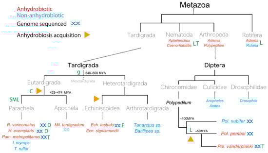 Life on Earth depends on aqueous biochemical reactions [], and approximately 70% of an animal’s body is composed of water []. Loss of water can cause incremental damage to biological systems at the cellular and tissue level. Therefore, most organisms take precautions against water loss by maintaining extra water or preventing water evaporation, depending on circumstances. However, several invertebrates have evolved a peculiar method of tolerating water loss. They can enter an almost completely dehydrated state when facing environmental desiccation and yet revive when rehydrated. This phenomenon is referred to as anhydrobiosis, a latent state of life induced by desiccation, first observed by Leeuwenhoek in 1702 []. Anhydrobiosis is considered to be a form of “cryptobiosis”, which is defined as “the state of an organism when it shows no visible signs of life and when its metabolic activity becomes hardly measurable or comes reversibly to a standstill” []. Metabolism is considered integral to life on earth, and hence cryptobiosis has been called a “third state of life” [], alongside “life” and “death”. Today, anhydrobiosis has been observed in multiple invertebrate lineages, e.g., brine shrimps, bdelloid rotifers, nematodes, midges and tardigrades, as well as in the other kingdoms of Plantae, Fungi and Prokaryota (Table 1) [,,,,,,,]. Anhydrobiosis capabilities during life cycles vary between species; there are species that can undergo desiccation throughout their whole life cycle, whereas others can do so in a particular stage (i.e., eggs, larvae; Table 2) [].