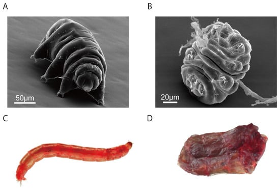 - Horikawa, D.D.; Arakawa, K. Tardigrades—Ultimate Animals Surviving Extreme Environments. SFC J. 2015, 15, 246–260. [Google Scholar]