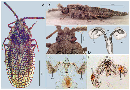 (A–C) One of two specimens of Recaredus rex sampled during the Czechoslovak–Iranian entomological expedition to Iran in 1977. (A) Habitus, dorsal view. (B) Habitus, lateral view. (C) Head, dorsal view. (D–F). Ductus seminis (ds), endosomal diverticula (ed) and endosomal sclerites (scl). (D) Recaredus rex (after [7], modified). (E) Derephysia foliacea (Fallén, 1807). (F) Kalama tricornis (Schrank, 1801) (after [33], modified).