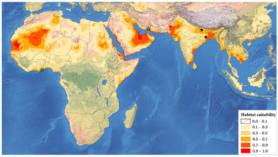 Maxent ecological niche modelling results for Recaredus rex. Red and dark orange colours mark areas with high habitat suitability for the species. Literature sites (India) are marked with black stars, while new locations (Iran, Ghana) are marked with green stars.