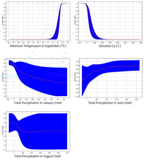 The mean AUC for ten replicate Maxent runs is 0.990, and the standard deviation is 0.003. The environmental variables response curves (Figure 3) and the jackknife test of variable importance (Figure 4) indicate that the most substantial impact on the Maxent prediction has a minimum temperature in September—a decrease in the average temperature this month below 27 °C significantly reduces the habitat suitability for this species. The elevation is also essential—the suitability of a location is better in the case of areas located at or below sea level.