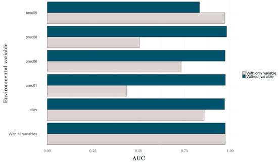 The jackknife test of variable importance. The grey colour indicates using a variable in isolation, and the blue colour specifies the modelling without the selected variable. The higher the score for the first (with only variable) and the lower for the second (without variable), the more critical the selected environmental variable is for the model (AUC—average area under the curve).